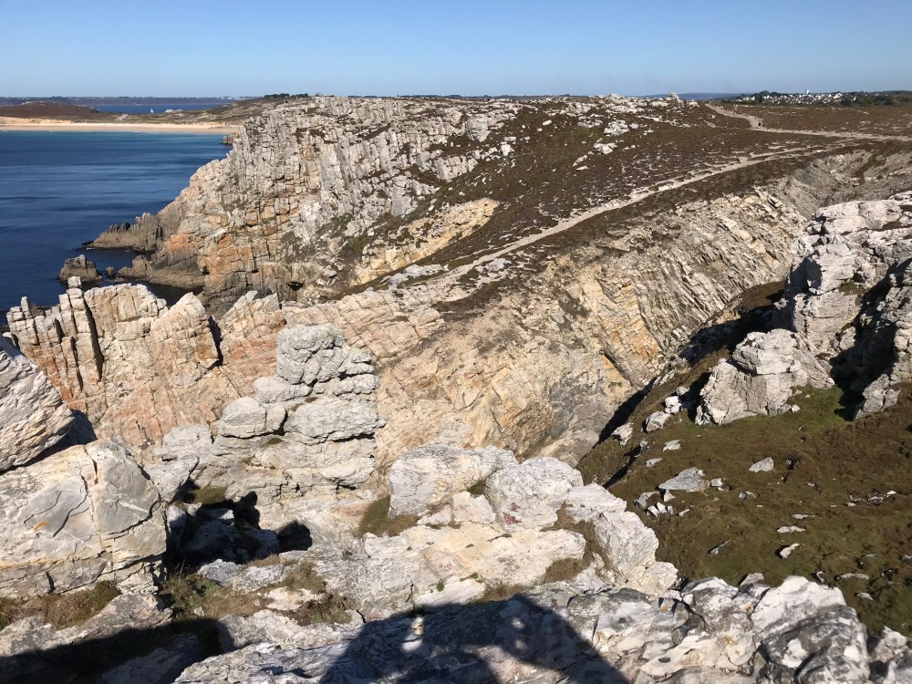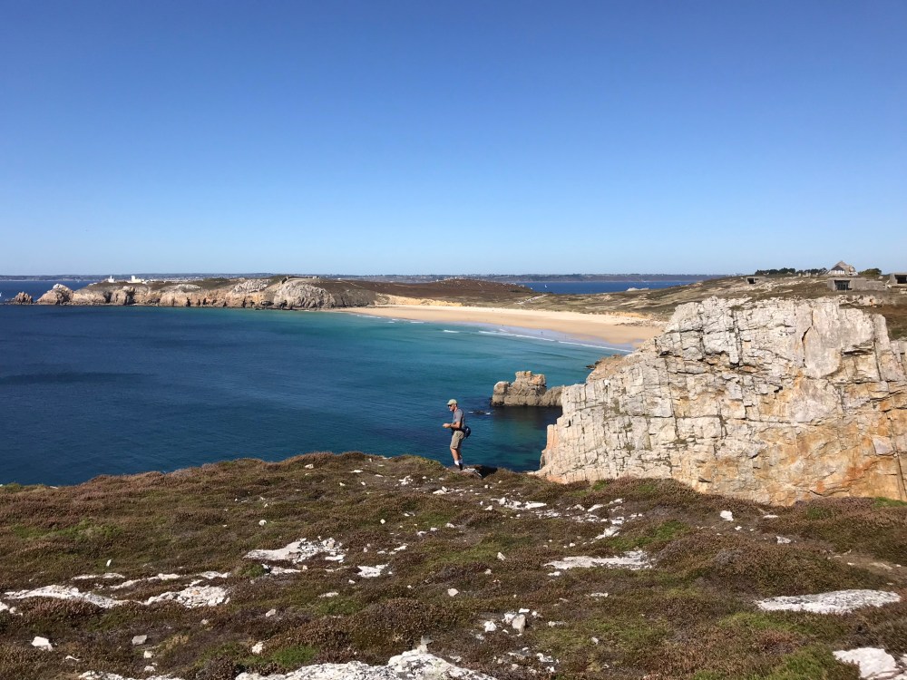 An einem grauen nieselnden Tag hat uns unsere erste Wanderung zu der Pointe de Pen Hir gefallen. (Schauen Sie unseren vorherigen Eintrag an.) Diese Woche sind wir an einem sehr sonnigen Tag nach Pen Hir zurückgegangen; die Aussicht haben zu spektakulär verbessert. Die Farbe des Wassers ist im Sonnenschein echt wunderschön.