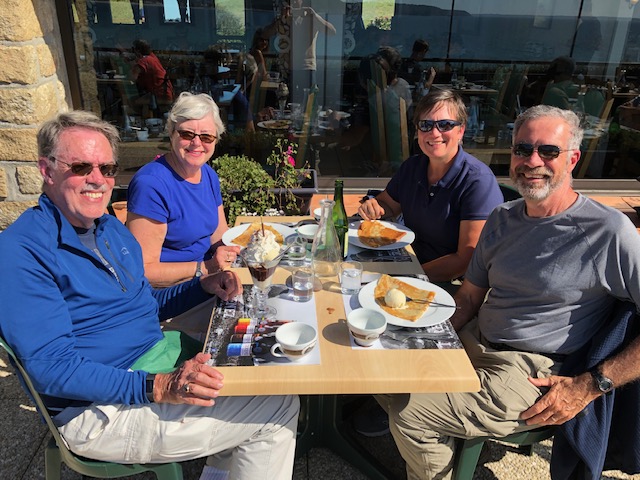 Zuerst haben wir uns jedoch mit Galette (pikante Buchweizen-Crêpes) und Crêpes (süße Weizen-Crêpes) gestärkt… obwohl auch ein Heiß-Ganache-Eisbecher gegessen worden ist. Auf dieser Reise war das unser erster Besuch in einer Crêperie. Vielen Dank, C & A, uns aus unserer Routine auszubrechen, zuhause zu essen. (Wer hätte gedacht, dass wir solcher Routine in Frankreich haben würden?) Die Crêperie Le Korrigan war ausgezeichnet – sowohl das Essen als auch die Aussicht aufs Meer.