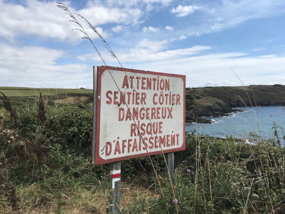 Eines der besten Dinge am GR34 (der Wanderweg, der an der Küste liegt) ist, dass er sehr nahe am Wasser liegt. Leider wird es dem Weg zum Verhängnis werden. Für einen Teil unserer Strecke geht der Weg die Straße anstatt der Klippe entlang, weil die Klippe jetzt unsicher ist:
